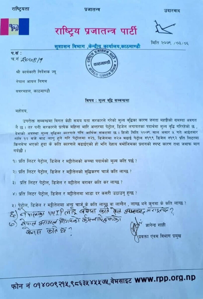 नेपाल आयल निगमलाई सोमबार पत्र बुझाउँदै राप्रपाले मूल्यवृद्धिसँग सम्बन्धित सात वटा प्रश्नको जवाफ मागेको छ ।