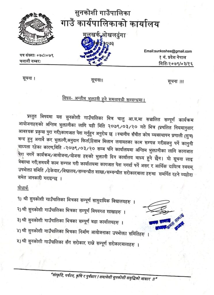 ओखलढुंगा ।  सुनकोशी गाउँपालिकाले चालु आर्थिक वर्षमा सञ्चालन भएका   कार्यक्रम  आयोजनाहरूको अन्तिम भुक्तानीका लागि कागजात पेश गर्न अनुरोध गरेको छ   ।