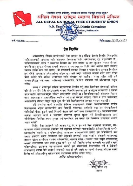 काठमाडौँ । नेपाल विद्यार्थी संघले सत्ताको बलमा त्रिवि सेवा आयोगमा लगाएको ताला खोल्न माग गर्दै अनेरास्ववियु त्रि.वि जिल्ला कमिटीले प्रदर्शन गरेको छ । अध्यक्ष भट्टले भने “नेविसंघले एक वर्षदेखि विभिन्न बहानामा त्रिविको विभिन्न निकायमा तालाबन्दी गर्ने र प्राज्ञिक कामहरूमा अवरोध सिर्जना गर्दै आइरहेको र सत्ताको बलमा आफ्नो निहित स्वार्थ पूर्तिका लागि ताला बन्दी र प्रदर्शन गरिरहेको छ ।”