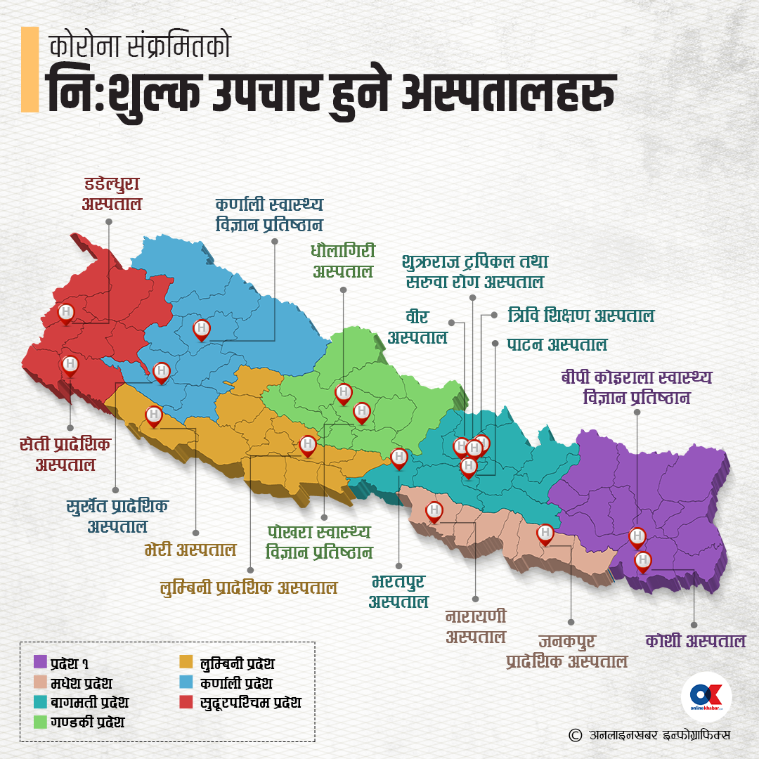 सरकारले तोकेका अस्पताल निःशुल्क सेवा लिनका लागि बिरामीमा मध्यम र गम्भीर समस्या भएको हुनुपर्छ । सरकारले तोकेका अस्पतालमा गए संक्रमितको उपचार निःशुल्क हुने व्यवस्था मिलाइएको सहप्रवक्ता डा. समिरकुमार अधिकारीले बताए । ‘मध्यम वा गम्भीर प्रकृतिका बिरामीलाई तोकिएको सरकारी अस्पतालमा निःशुल्क उपचार सेवा पाउने व्यवस्था मिलाइएको छ,’ डा. अधिकारीले भने, ‘तर, अहिले निजीमा यो व्यवस्था लागु गरिएको छैन ।’