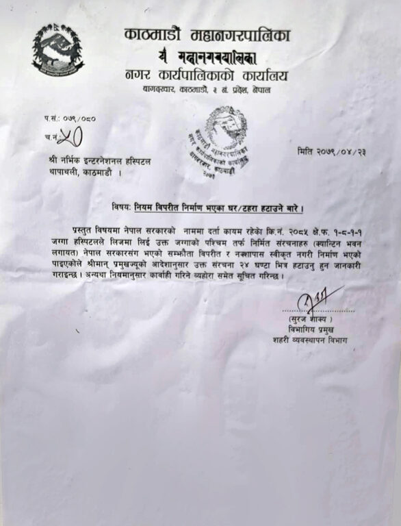 नर्भिक अस्पतालले लिजमा लिएको एक रोपनी ८ आना जग्गाको पश्चिमतर्फ सम्झौता विपरीत र नक्सा पास नगरी घर टहरा बनाएको भन्दै ती संरचना २४ घण्टाभित्र हटाउन मेयर साहले निर्देशन दिएका हुन् ।