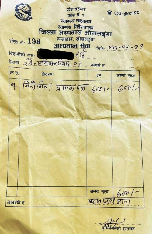 ओखलढुङ्गा । ओखलढुङ्गामा निरोगिताको प्रमाण लिन नागरिकले सरकारी अस्पतालमा चर्को शुल्क तिर्न बाध्य छन् । जिल्ला अस्पताल रुम्जाटार मार्फत निरोगिताको प्रमाण लिन नागरिकले चर्को शुल्क बुझाउनु पर्ने तथ्य फेला परेको छ । यसको मारमा विशेष गरी सवारी चालक अनुमती पत्र नविकरण गर्ने नागरिक परेका छन् ।