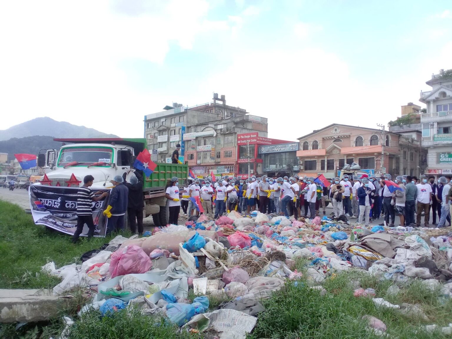 सरकारले ७५ दिनसम्म काठमाडौँमा फोहोर थुपारेर बसेको भन्दै युवासंघले ‘हाम्रो काम हामी आफै गर्नु पर्छ, आफ्नो क्षेत्र आफै सफा गर्नु पर्छ’ नाराका साथ फोहोर उठाउने काम गरिरहेको छ ।