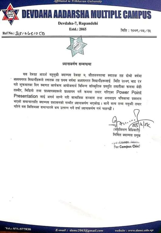 क्याम्पसको प्रतिष्ठामा आच पुर्याउनु हाम्रो उद्देश्य होइन । तर क्याम्पस कै सुधारका लागि समाचार प्रकाशन गर्दा भ्रामकको ट्याग दिनु लज्जाको विषय हो । क्याम्पसका सरोकारवालाहरूको ध्यान आफ्नो कमजोरी ढाकछोप गरि विज्ञप्ति जारी गर्नमा भन्दापनि क्याम्पस सुधार तर्फ केन्द्रित हुन आवश्यक छ ।