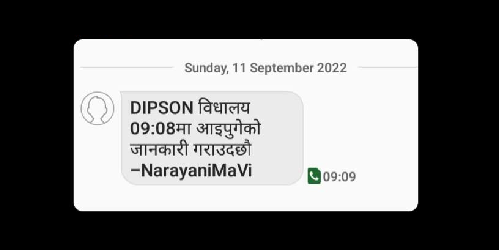भरतपुर । चितवनको एक सामुदायिक विद्यालयले मोबाइल म्यासेजमार्फत विद्यार्थी विद्यालय पुगेको र बाहिरिएको जानकारी दिने प्रविधि प्रयोगमा ल्याएको छ । भरतपुर महानगरपालिका–१० स्थित नारायणी नमूना माविले विद्यार्थीलाई समयमै विद्यालय आउने र घर जाने वातावरण बनाउन अभिभावकको मोबाइलमा म्यासेज पठाउन थालेको हो ।