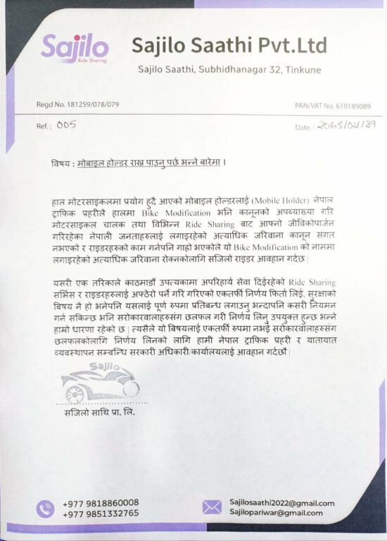 एक विज्ञप्ति जारी गर्दै सजिलो साथीले मोटरसाइकलमा प्रयोग हुँदै आएको मोबाइल होल्डरलाई नेपाल ट्राफिक प्रहरीले बाइक मोडीफिकेसन भनी कानूनको अपव्याख्या गर्दा मोटरसाइकल चालक तथा विभिन्न राइड सेयरिङबाट आफ्नो जीविकोपार्जन गरिरहेकालाई समस्या परेको उल्लेख गरेको छ ।
