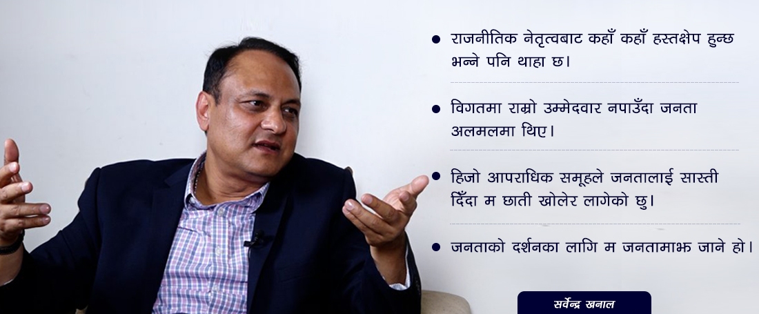 काठमाडौं । नेकपा एमालेका नेता तथा काठमाडौं क्षेत्र नम्बर–६ का प्रतिनिधि सभा सदस्य उम्मेदवार सर्वेन्द्र खनालले चुनाव जितेर देश र जनताप्रति इमान्दार सिपाहि भएर काम गर्ने बताएका छन् । पत्रकार नविन धमलासँग प्राइमटाइम्स टेलिभिजनको कार्यक्रम स्थानीय जनसरोकारमा कुरा गर्दै खनालले मंसिर ४ को चुनावबाट जनमत प्राप्तगरि देश र जनताको पक्षमा काम गर्ने बताएका हुन् ।