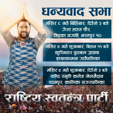 उनले विजय र्यालीको साटो धन्यवाद सभा गर्ने उल्लेख गरेका छन् । त्यहाँ आउनेहरुलाई फूलमाला, अविर वा खादा नल्याउन उनको आग्रह छ ।