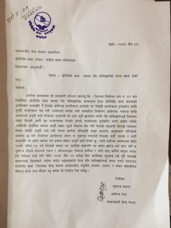 समाजवादी केन्द्र नेपालका नेता युवराज सफलले बिहीबार रवि लामिछानेलाई प्रतिनिधिसभा सदस्य पदको शपथ नगराउन मागसहित निवेदन दिएका हुन् ।