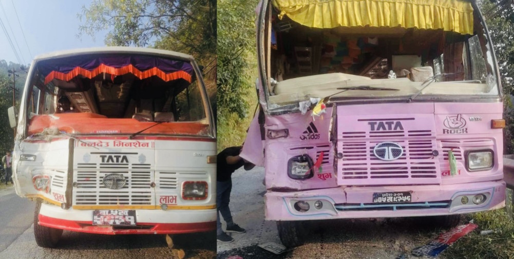 बा५ ख ५६३१ नम्बर र प्रदेश ३.०१०५ ख ३९५६ नम्बर बस एक आपसमा आईतबार दिउँसो ठकिएर दुर्घटना भएको हो।