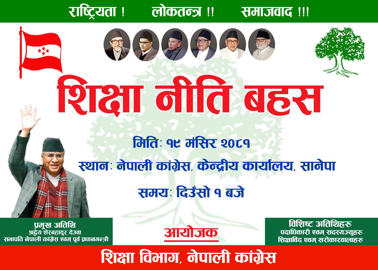 नेपाली कांग्रेस केन्द्रीय सदस्य एवम् केन्द्रीय शिक्षा विभाग प्रमुख नैनसिंह महरको अध्यक्षतामा हुने कार्यशालालाई पार्टी सभापति एवम् पूर्व प्रधानमन्त्री शेरबहादुर देउवाले सम्बोधन गर्नेछन् ।