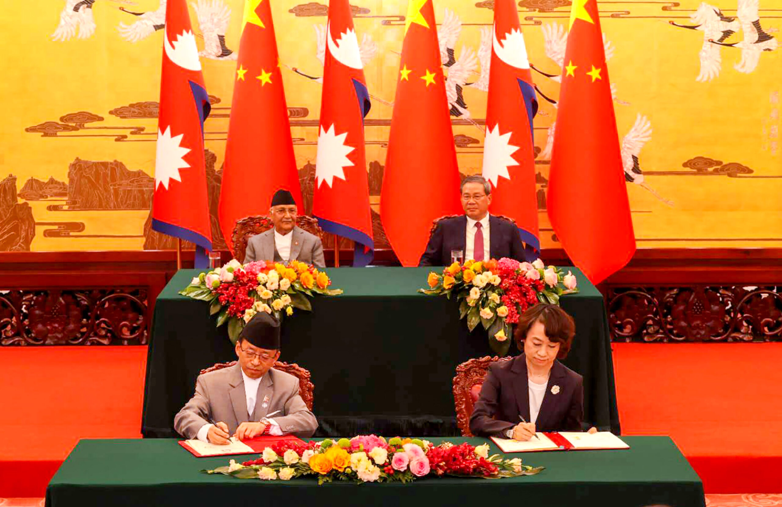 चीनको औपचारिक भ्रमणमा रहनुभएका प्रधानमन्त्री केपी शर्मा ओली र उहाँका चिनियाँ समकक्षी लि छ्याङको उपस्थितिमा नेपाल र चीनबीच विभिन्न समझदारी भएको छ । दुवै देशका प्रधानमन्त्रीबीच द्विपक्षीय वार्तापछि पारस्परिक सहयोगसम्बन्धी सम्झौतामा हस्ताक्षर भएको हो ।