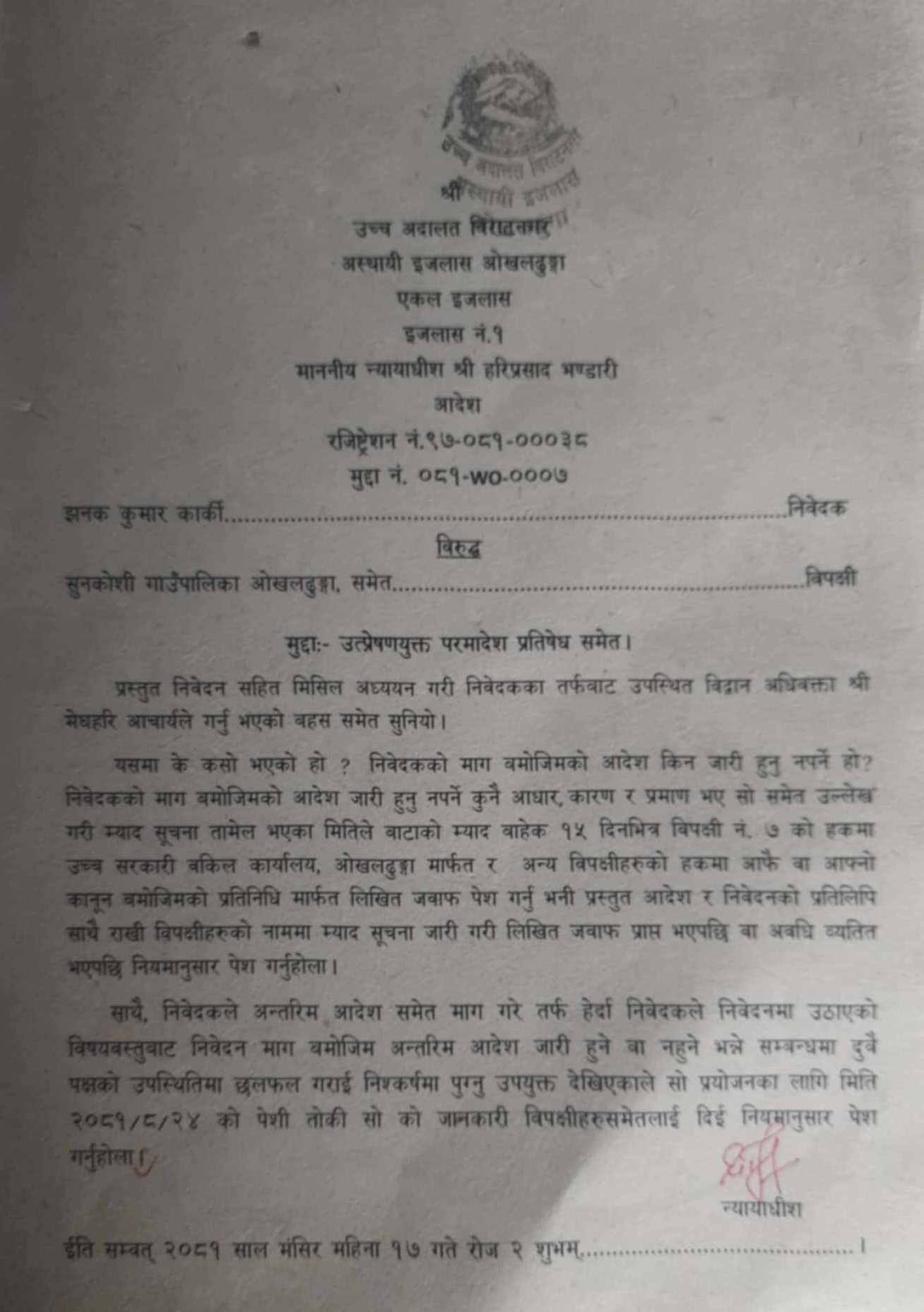ओखलढुंङ्गाको सुनकोशी गाउँपालिका विरुद्ध उच्च अदालतमा मुद्दा दर्ता भएको छ । स्थानीय सरकारले क्षेत्राधिकार बाहिर गएर दरबन्दि कट्टासहितको शिक्षक सरुवा गरेर सामुदायिक विद्यालय सञ्चालनमा समस्या सिर्जना गरेको भन्दै कटुञ्जे माविका विव्यस अध्यक्ष झनककुमार कार्कीले गाउँपालिकाको शिक्षक सरुवाको निर्णय बदर गराउन माग गर्दै अदालतमा मुद्दा दर्ता गरेका हुन् ।