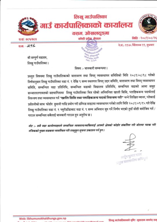 ओखलढुङ्गा लिखु गाउँपालिकामा खाली सिसी र प्लाष्टिक जन्य पद्धार्थको ब्यबस्थापन सम्बन्धि अभियान सुरु भएको छ ।गाउँपालिकाको वातावरण तथा विपद व्यबस्थापन समितिको आयोजनामा उक्त अभियान पुष १५ गतेबाट पालिकाका सबै वडामा सुरु भएको हो ।