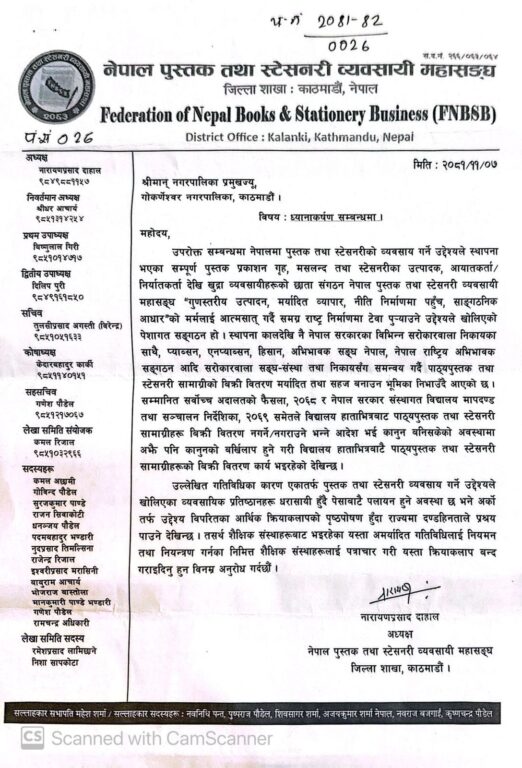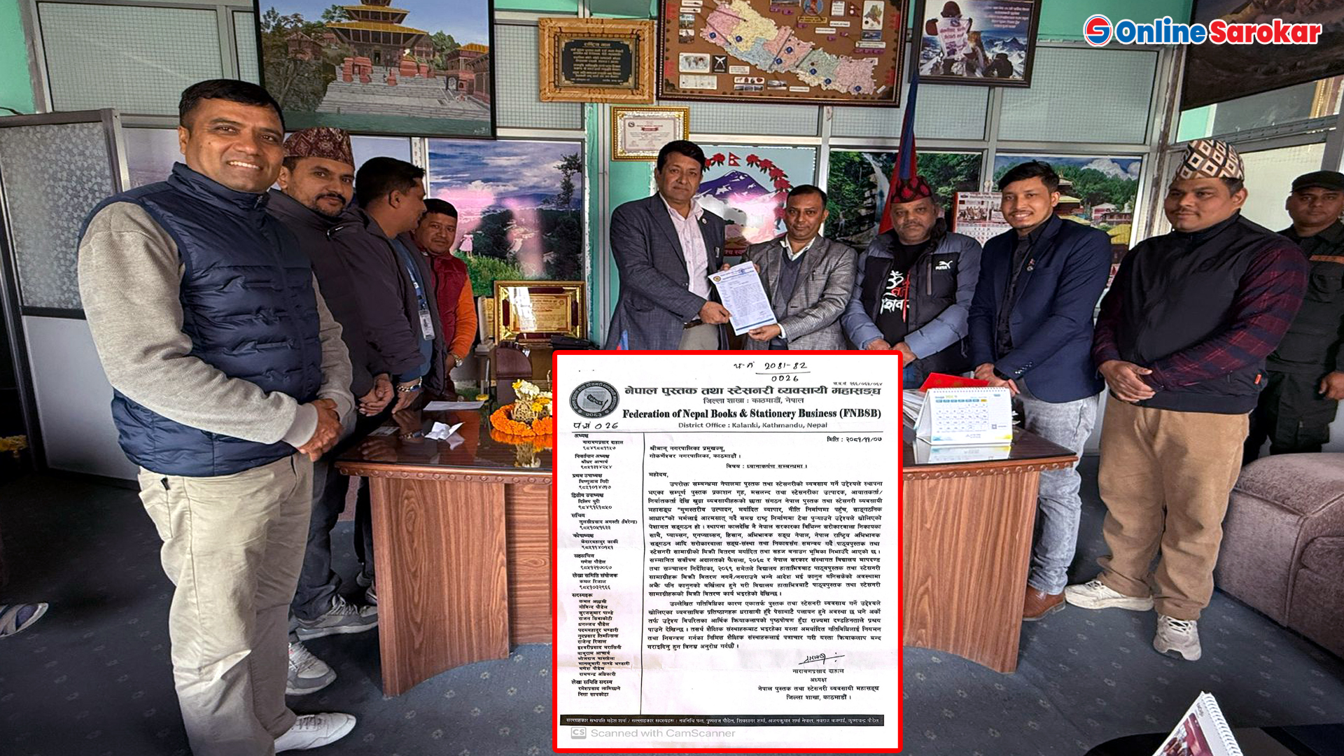 नेपाल पुस्तक तथा स्टेसनरि व्यवसाय महासङ्घ जिल्ला शाखा काठमान्डौंले पाठ्यपुस्तक तथा स्टेसनरि सामाग्रीहरुको विद्यालय हातभित्रबाटै विक्री वितरण भएको सन्दर्भमा ध्यानाकर्षण पत्र बुझाएको छ ।