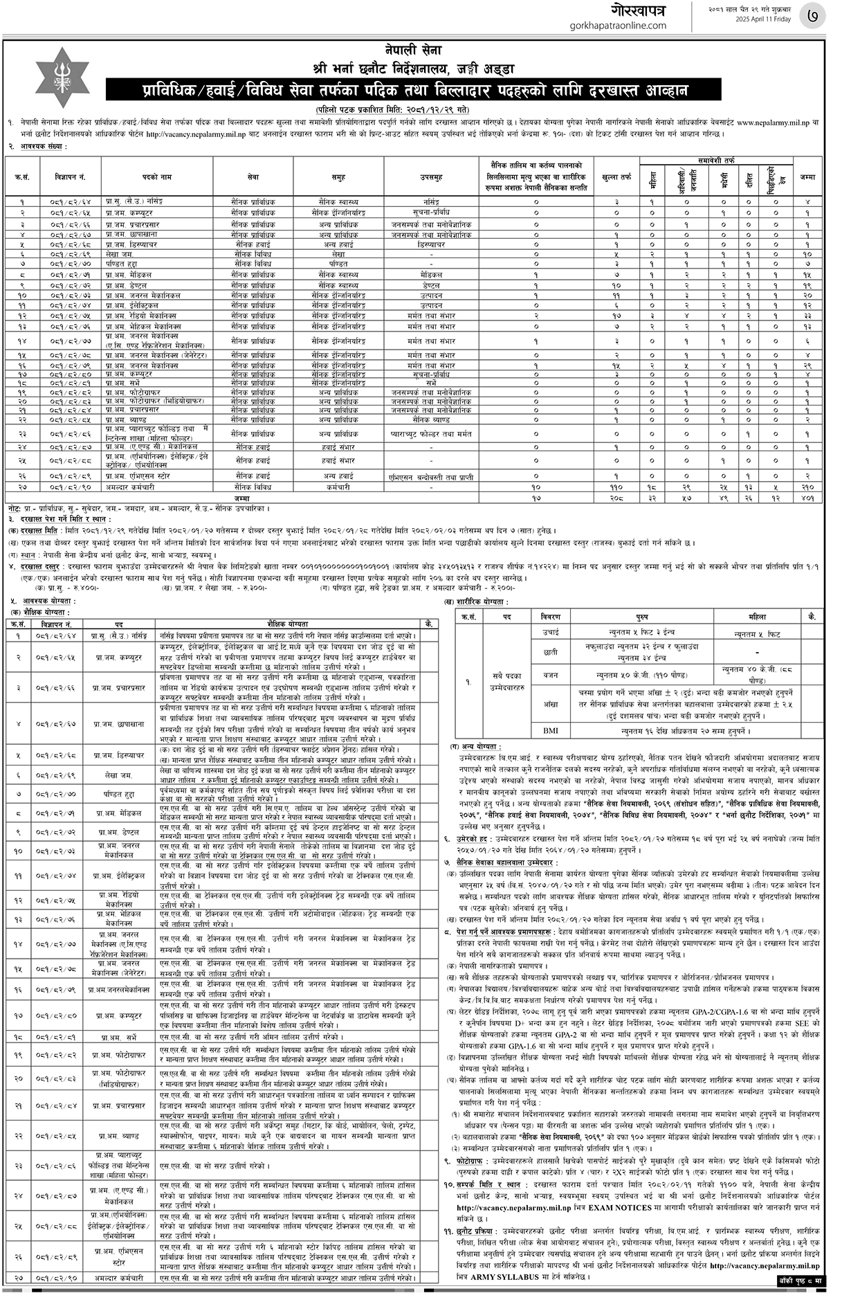 नेपाली सेनाले प्रकाशन गरेको सूचना अनुसार, स्वीकृत दरबन्दीभित्र रहेका सैन्य पदहरू खुला तथा समावेशी प्रतियोगितात्मक प्रक्रियाबाट पदपूर्ति गरिनेछ। यसका लागि सेनाले तोकिएको भर्ना केन्द्रमा आवेदन फाराम बुझाउन आवेदकहरूलाई आग्रह गरेको छ।