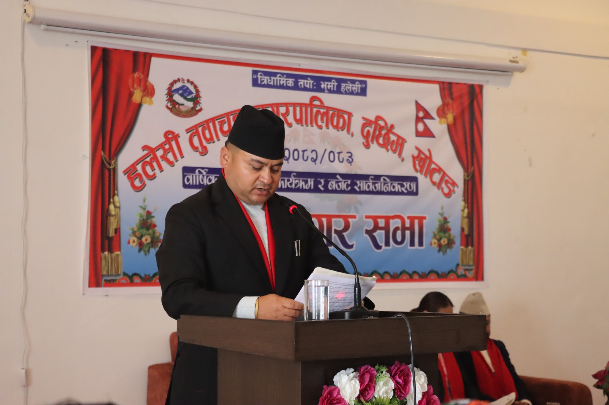 खोटाङको हलेसी तुवाचुङ नगरपालिकाले ८० करोड १८ लाख ८१ हजार ७ सय १९ रुपैंयाको बजेट ल्याएको छ । १७ औँ नगरसभामा उपप्रमुख रमेश कुमार राउतले आगामी आर्थिक वर्ष २०८२-०८३ का लागि ८० करोड १८ लाख ८१ हजार ७ सय १९ रुपैंयाको बजेट प्रस्ताव गरेका हुन् ।