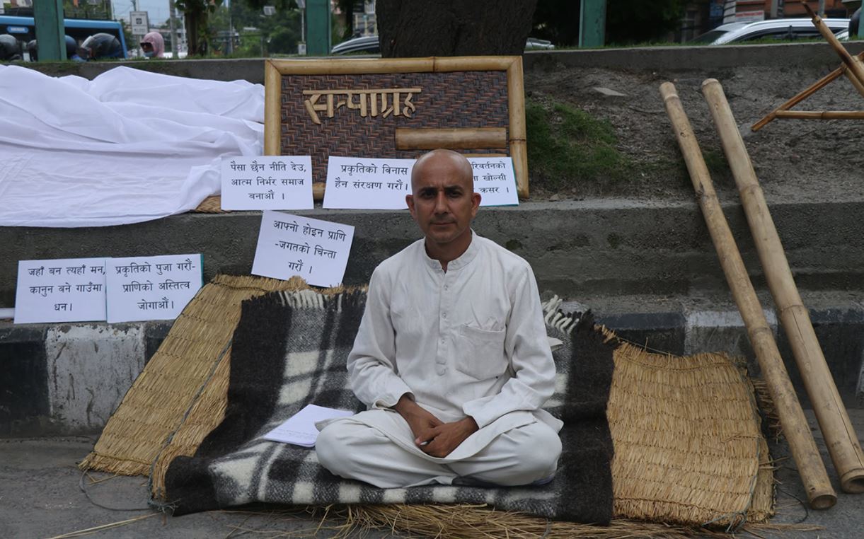 उनले ‘पैसा छैन नीति देउ, आत्मनिर्भर समाज बनाऔं,’ ‘प्रकृतिको विनास हैन, संरक्षण गरौं,’ ‘जलवायु परिवर्तनको असर, खोला खोल्सी अनियन्त्रित क्रसर’, ‘प्रकृतिको पूजा गरौं, प्राणीको अस्तित्व जोगाऔं,’ लगायतका नारा लेखिएका प्लेकार्ड पनि साथमा राखेका छन् ।