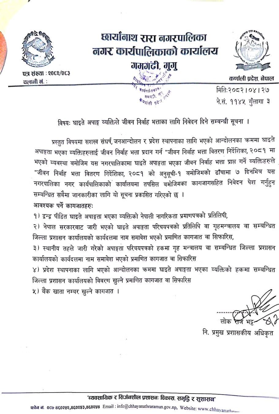 मुगुको छायाँनाथ रारा नगरपालिकाले नगरपालिका भित्रका घाइते अपाङ्ग भएका व्यक्तिहरूलाई जीवन निर्वाह भत्ता दिने भएको छ । सशस्त्र संघर्ष, जनआन्दोलन तथा प्रदेश स्थापनाका क्रममा घाइते भई अपाङ्ग अवस्थामा रहेका व्यक्तिहरुको सहजताका लागि नगरपालिकाले जीवन निर्वाह भत्ता दिने भएको हो ।