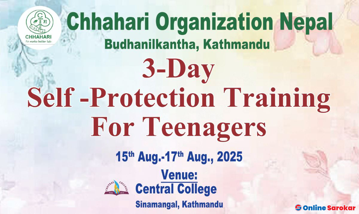 छाहारी संस्था नेपालद्वारा आयोजित किशोर–किशोरीका लागि तीन दिने आत्मरक्षा तालिम शुक्रबारबाट सुरु भएको छ । सेन्ट्रल कलेज, सिनामंगलमा भएको उद्घाटन कार्यक्रममा संस्थाका अध्यक्ष राघव शर्मा र संस्थापक अध्यक्ष ङिमा दावा तामाङ प्रमुख अतिथि रहनुभएको थियो।