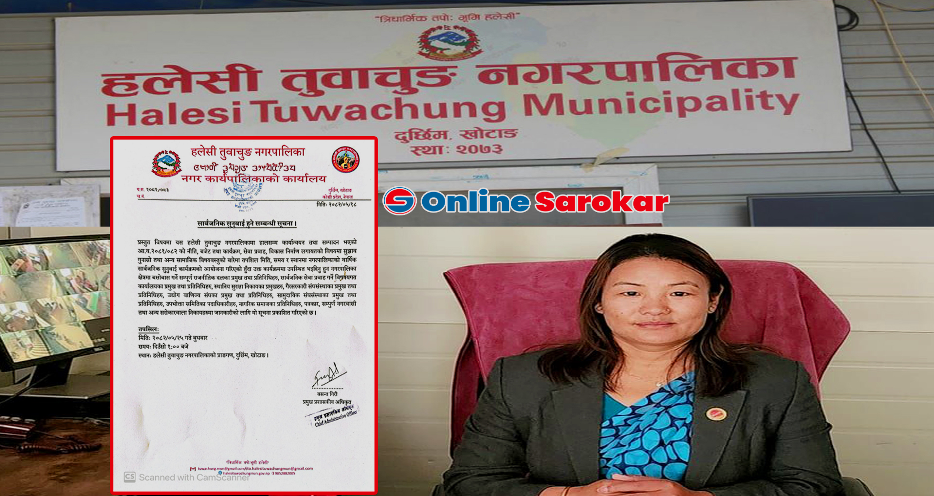 खोटाङको हलेसी तुवाचुङ नगरपालिकाले चालु आर्थिक वर्ष २०८१ र ८२ मा कार्यान्वयन तथा सम्पन्न भएका नीति, बजेट, कार्यक्रम, सेवा प्रवाह र विकास निर्माणसम्बन्धी विषयमा सार्वजनिक सुनुवाइ गर्ने भएको छ ।