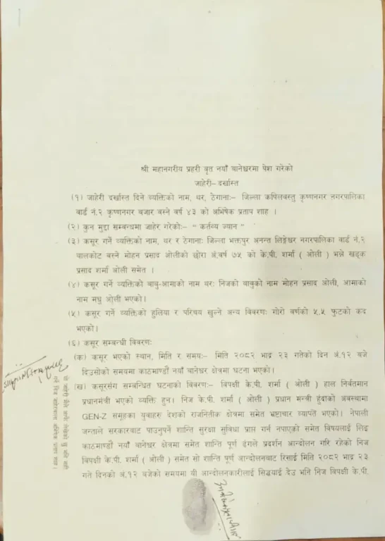 शनिबार कपिलवस्तुबाट नेता शाहले ओलीविरुद्ध मिति २०८२ भाद्र २३ गते काठमाडौंको नयाँ वानेश्वर क्षेत्रमा भएको घटनाका सम्बन्धमा जाहेरी दिएका हुन् ।