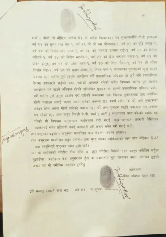 ‘जनताले सरकारवाट पाउनुपने शान्ति सुरक्षा सुविधा प्राप्त गर्न नपाएको समेत विषयलाई लिए काठमाडौं, नयाँ वानेश्वर क्षेत्रमा समेत शान्ति पूर्ण ढंगले प्रदर्शन आन्दोलन गरि रहेको निज विपक्षी के.पी. शर्मा ओली समेत सो शान्ति पूर्ण आन्दोलनबाट रिसाई मिति २०८२ भाद्र २३ गते दिनको अं. १२ बजेको समयमा यी आन्दोलनकारीलाई सिद्धयाई देउ भनि निज विपक्षी के.पी. ओली शर्मा ओलीले मौखिक आदेश दिए सो आदेश क्रियान्वयन भइ सुरक्षाकर्मीले गोली चलाउँदा वर्ष २१ को सुलभ राज श्रेष्ट–१, वर्ष १९ को श्री यम चौलागाइ–१, वर्ष ४२ को बुद्धि तमाड–१, वर्ष १८ को मिसल सारु मगर–१, वर्ष ४५ को पारुहाड उतमल राई–१, वर्ष २४ को योगेन्द्र न्यौपाने–१, वर्ष ३४ को विनोद महर्जन–१, वर्ष ४२ को दिल नारायण तमाड–१, वर्ष २१ को प्रवीन कुलुङ्ग, वर्ष २१ को उमेश महत–१, वर्ष १७ को निता गौतम–१, वर्ष २१ को शौरभ किशोर श्रेष्ट–१, वर्ष २८ को सुवाष बोहोरा–१, निरज पन्त–१ लगायतका युवाहरूको मृत्यु भएको अवस्था छ ।’