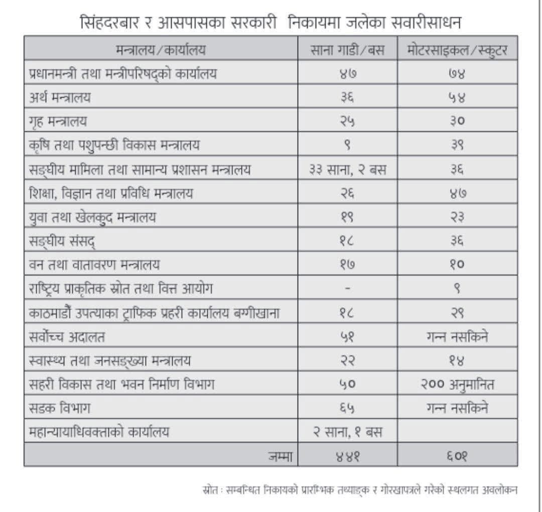 भदौ २३ गते जेनजी युवाको आन्दोलनमा १९ जनाको मृत्यु भएपछि उच्चपदस्थ कर्मचारीहरुले सडकमा सरकारी गाडी असुरक्षित हुन सक्ने भन्दै कार्यालय परिसरमै पार्किङमा राख्न भनेका थिए ।