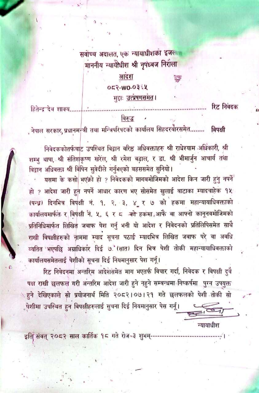 न्यायाधीश नृपध्वज निरौलाको इजलासले प्राधिकरणका निर्वतमान कार्यकारी निर्देशक हितेन्द्र देव शाक्यले दायर गरेको रिटमा कारण देखाउ आदेश जारी गर्दै दुवै पक्षलाई छलफलका लागि बोलाएको हो । ।