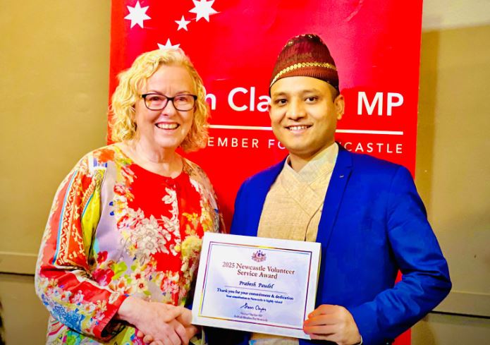 अष्ट्रेलियामा बसेर नेपाली समुदायको नाम उकास्ने काममा अग्रसर रहेका प्रवेश पौडेलले न्युक्यासल स्वयंसेवी सेवा पुरस्कार २०२५ प्राप्त गरेका छन् । बहुसांस्कृतिक समाजमा स्वयंसेवी भएर उत्कृष्ट काम गरेको भन्दै अष्ट्रेलियाकी प्रतिनिधि सभाका उपसभामुख (डेपुटी स्पीकर) समेत रहेका न्यूक्यासलका संघीय सांसद शेरोन क्लेडनले नेपाली युवा पौडेललाई न्युक्यासल स्वयंसेवी सेवा पुरस्कार २०२५ प्रदान गरेकी हुन् ।