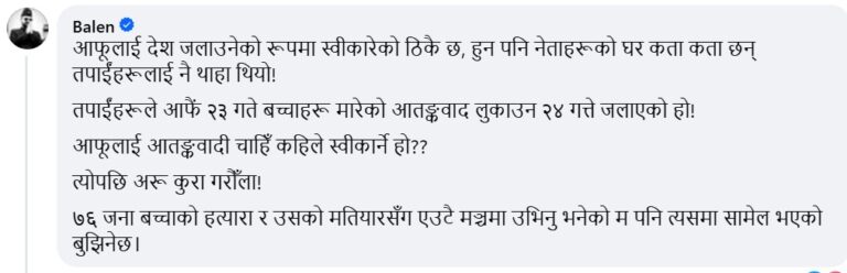भदौ २३ गतेको जेनजी आन्दोलनमा चरम दमन भएको भन्दै बालेनले त्यसलाई लुकाउन २४ गते जलाइएको उल्ल्ख गरेका छन् । तपाईंहरूले आफैँ २३ गते बच्चाहरू मारेको आतंकवाद लुकाउन २४ गत्ते जलाएको हो,बालेनले लेखेका छन्, आफूलाई आतंकवादी चाहिँ कहिले स्वीकार्ने हो रुरु त्योपछि अरू कुरा गरौँला ।