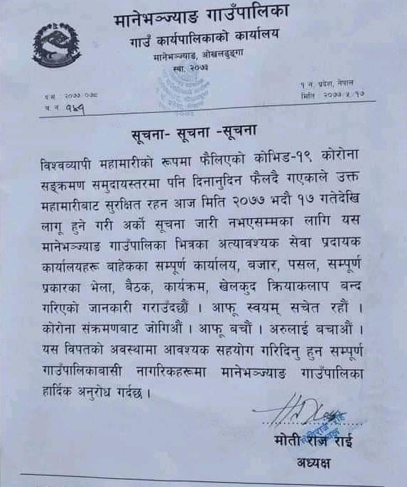 गाउँपालिका अध्यक्ष मोति राज राईले जारी गरेको सुचनामा बजार, पसल, सम्पूर्ण प्रकारको भेला, बैठक, कार्यक्रम, खेलकुद क्रियाकलापहरु बन्द गरिएको उल्लेख छ ।