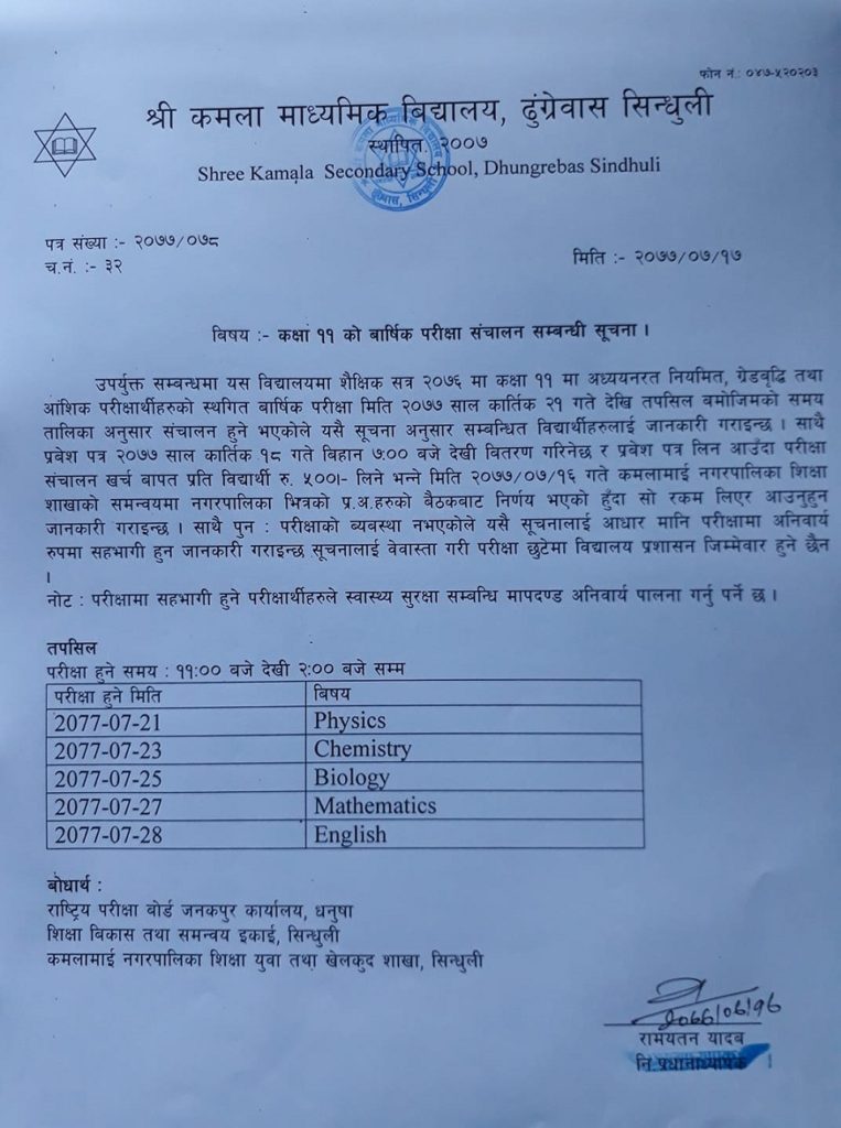 शिक्षा विकास तथा समन्वय ईकाईका सिन्धुलीका प्रमुख नेत्रप्रसाद गजुरेलले राष्ट्रिय परिक्षा बोर्डले कोभिड–१९ का कारण रोकिएको कक्षा ११ को परिक्षा विद्यालय आफैले सञ्चालन गर्ने कार्य विधि बनाएको जानकारी दिए। गजुरेलका अनुसार परिक्षामा सिन्धुली जिल्लाका क्याम्पस सहित ६३ वटा माविका कक्षा ११ मा अध्ययनरत तीनहजार १५० विद्यार्थी सहभागि हुने छन् ।