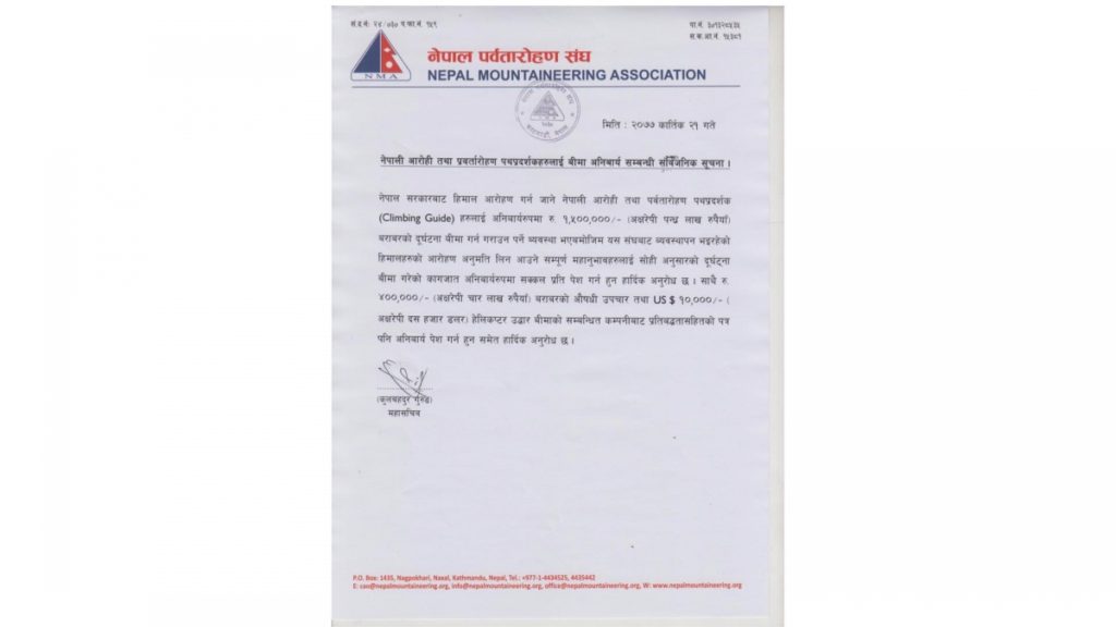 संघले आफ्ना मातहतमा रहेका विभिन्न २७ वटा हिमाल आरोहण गर्न उक्त रकम बराबरको बीमा अनिवार्य गर्न र सोही अनुसारको कागजात पेश गर्नुपर्ने समेत जनाएको छ ।