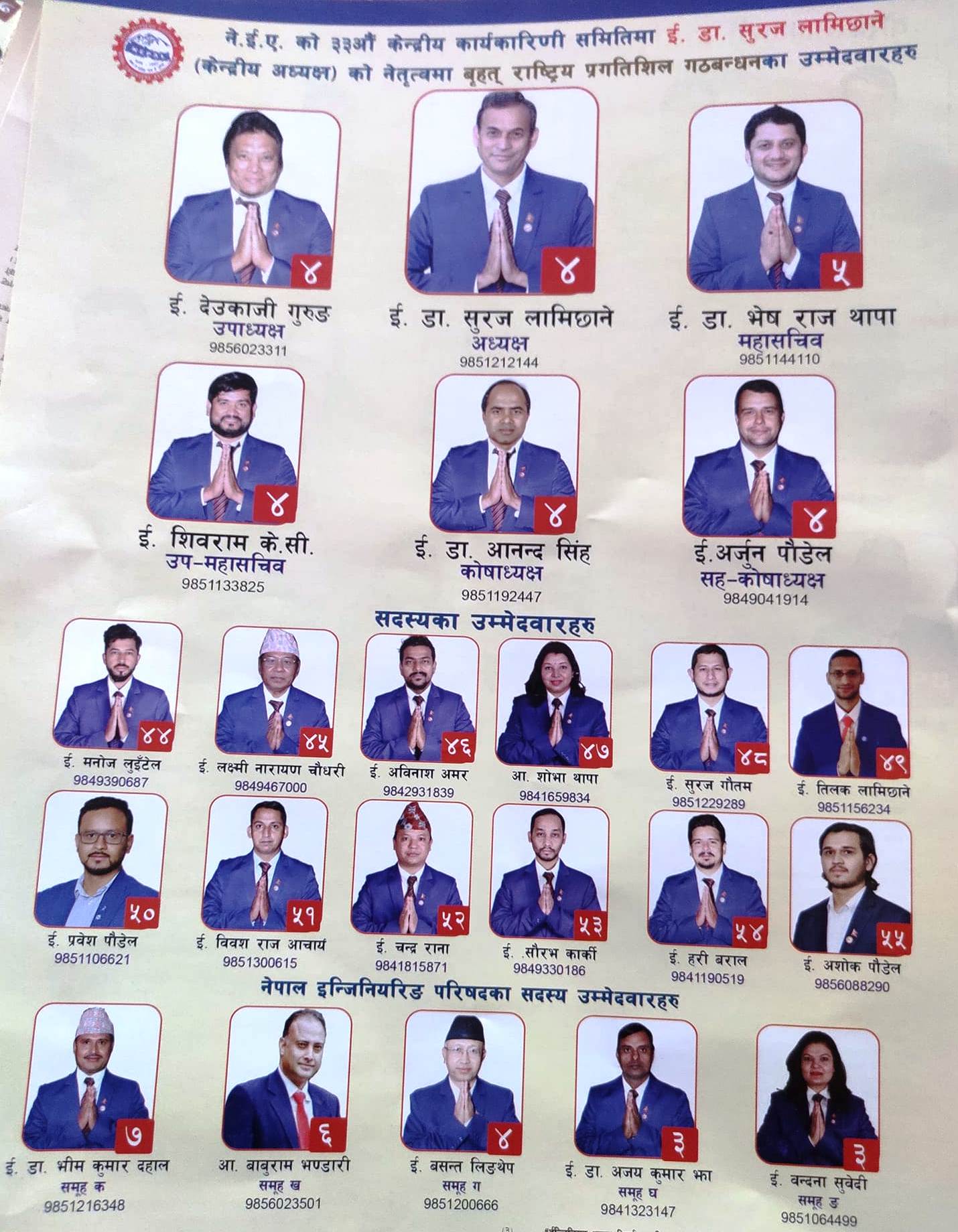फाल्गुण २७ गते हुने एशोसिएसनको ३३ औं केन्द्रीय कार्यकारिणी समितिको निर्वाचनमा ईन्जिनियर डा. सुरज लामिछानेको नेतृत्वमा बृहत् राष्ट्रिय प्रगतिशिल गठबन्धनका उमेद्वार चुनावी मैदानमा छन् ।