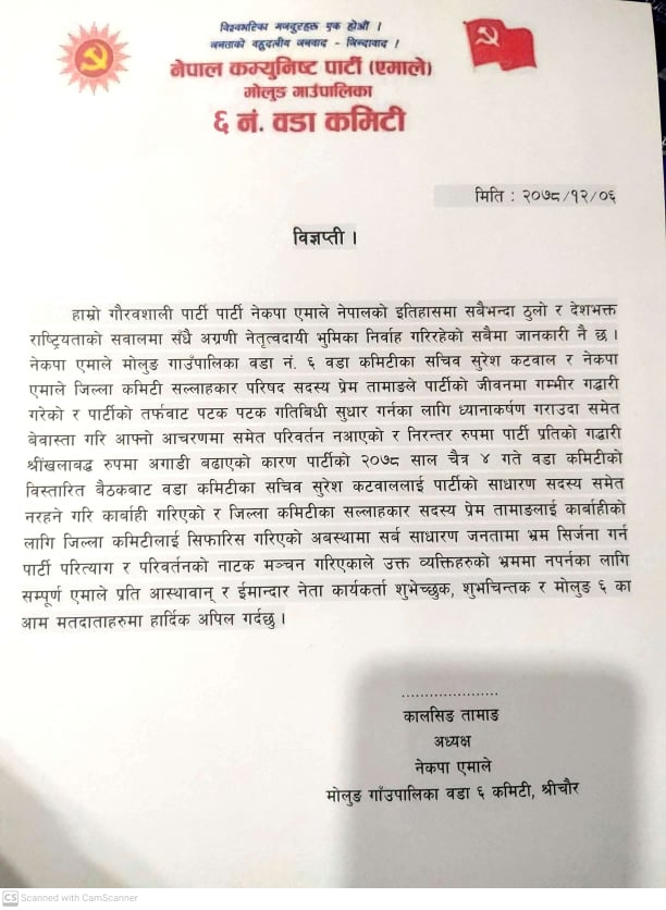 २०७८ चैत्र ४ गतेको वडा कमिटीको बैठकले पार्टी हित विपरित क्रियाकलाप गरेको भन्दै वडा कमिटी सचिव सुरेश कट्वाललाई साधारण सदस्य समेत नरहने गरि निष्कासन गर्ने र सल्लाहकार सदस्य प्रेम तामाङलाई कारबाहीका लागि जिल्ला कमिटीलाई सिफारीस गर्ने निर्णय गरेको थियो ।