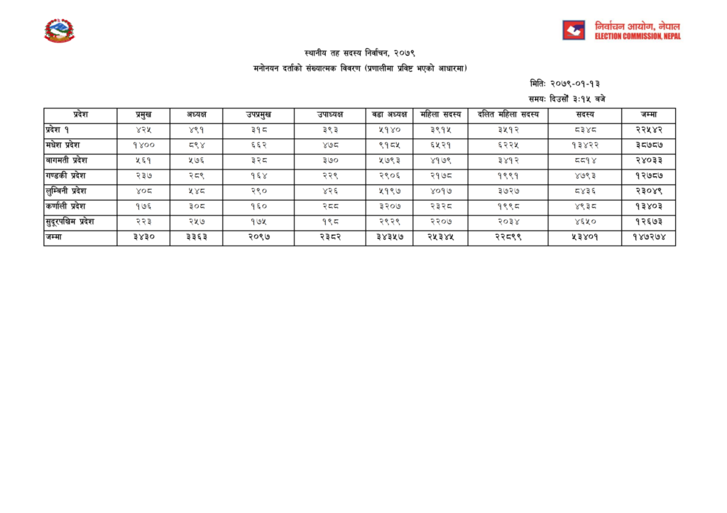 निर्वाचन आयोगका अनुसार हालसम्म प्रमुख पदमा ३ हजार ४३० जना, अध्यक्षमा ३ हजार ३६३, उपप्रमुखमा २ हजार ९७, उपाध्यक्षमा २ हजार ३८२ जनाको उम्मेदवारी परेको छ । यस्तै वडाध्यक्षमा ३४ हजार ३५७ जनाको उम्मेदवारी पर्दा बाँकी पदमा महिला सदस्य, दलित सदस्य र खुला सदस्यको उम्मेदवारी परेको छ ।