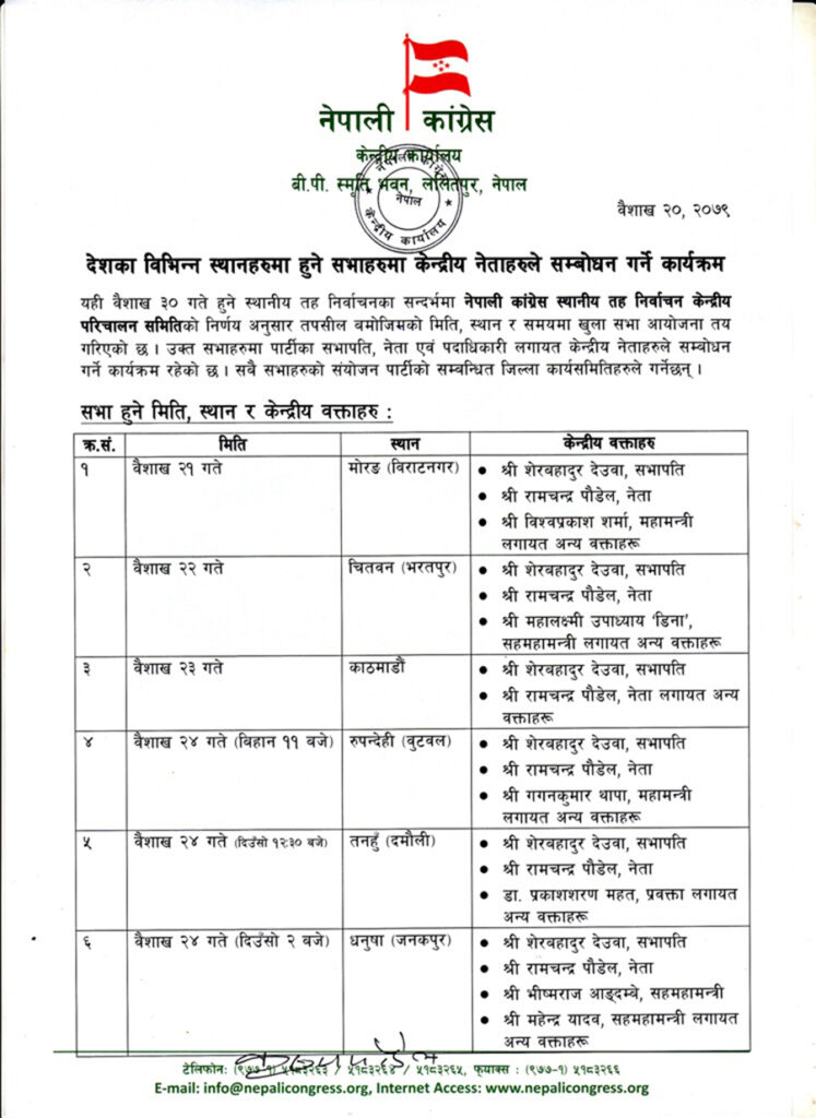 नेपाली कांग्रेस स्थानीय तह निर्वाचन केन्द्रीय परिचालन समितिको निर्णय अनुसार २१ वैशाखमा विराटनगरमा, २२ वैशाखमा चितवनको भरतपुरमा, २३ वैशाखमा काठमाडौंमा, २४ वैशाखमा रुपन्देहीको बुटवलमा, २४ वैशाखमा तनहुँको दमौली र धनुषाको जनकपुरमा, २५ वैशाखमा कास्कीको पोखरा र दाङको तुलसीपुरमा, २६ वैशाखमा कैलालको धनगढीमा र २७ वैशाखमा डडेलधुरामा चुनावी सभा आयोजना हुने भएको हो ।