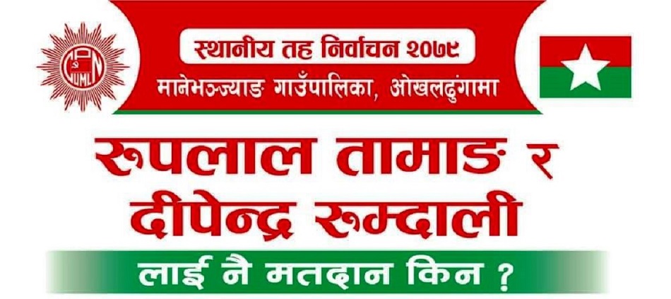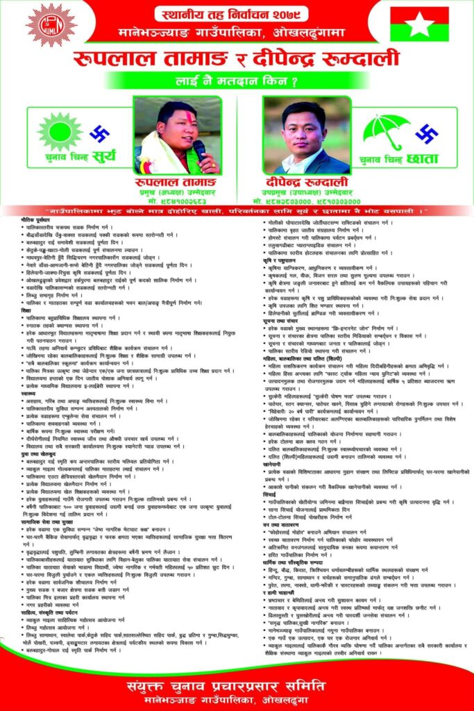 काठमाडाैं । ओखलढुंगाको मानेभञ्ज्याङमा एमाले–जसपा गठबन्धनका उम्मेदवारले साझा प्रतिवद्धता सार्वजनिक गरेका छन् । गाउँपालिका अध्यक्षका उम्मेद्वार रुपलाल तामाङ र उपाध्यक्षका उम्मेदवार दीपेन्द्र रुम्दालीले चुनावी अभियानका क्रममा साझा प्रतिवद्धतापत्र सार्वजनिक गरेका हुन् ।