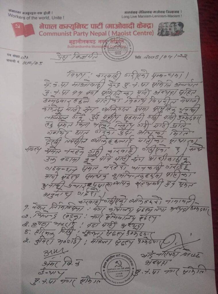 शुक्रबार नगर कमिटी अध्यक्ष भाईनारायण श्रेष्ठ र नगर कमिटी इन्चार्ज अम्बर विकले विज्ञप्ती निकालेर कांग्रेससँग साँठगाँठ गर्ने नेता कार्यकर्तालाई कारबाही गरिएको जानकारी दिएका छन् ।