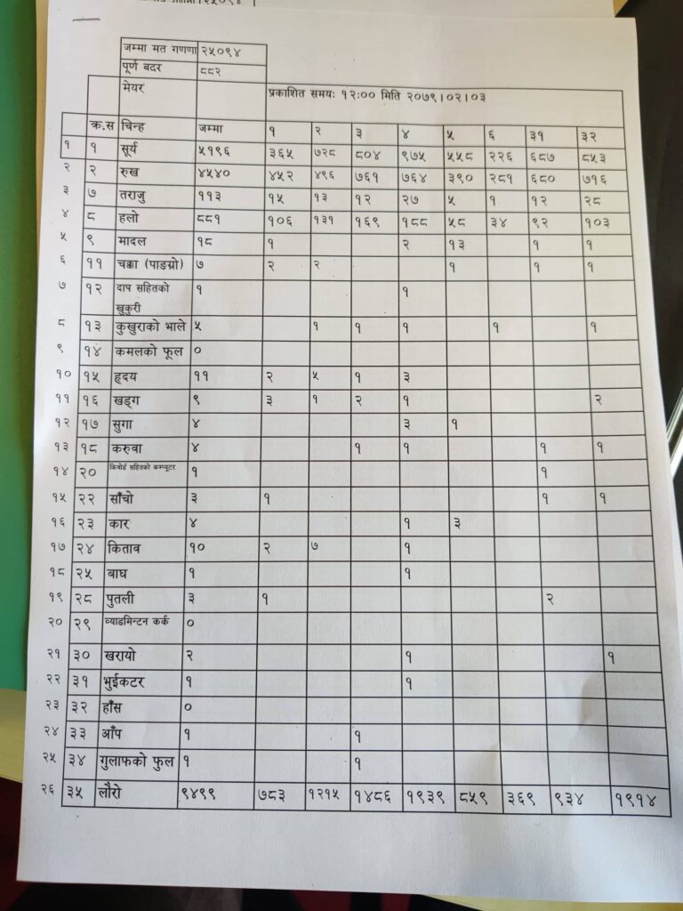 रोचक त के छ भने काठमाडौं महानगरपालिकामा उम्मेदवारी दिएकामध्ये १९ उम्मेदारले हालसम्म एक मत पनि पाउन सकेका छैनन् । यसरी शून्य मत ल्याउनेमा चुनाव चिह्नहरु कलमको फूल, ब्याडमिन्टन कर्क, हाँस, सेफ्टी पिन, बिरालो, प्रेसर कुकर, चुलेसी, भ्यागुतो, कक प्लेट, ठेकी, जोडी कमबुट, भालु, घण्टाघर, कंगारु, फ्रक, चौबन्दी चोलो, खसीको टाउको, बदेल र ग्यास सिलिन्डर भएका पाएका उम्मेदवारहरु रहेका छन् ।