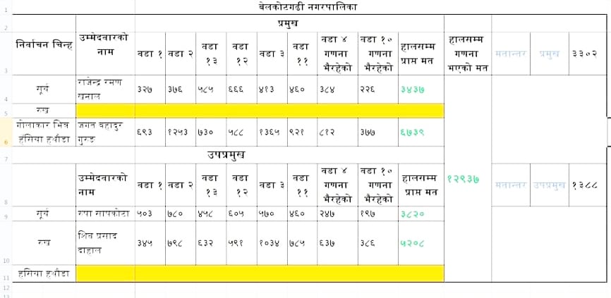 सिव दाहाल अग्र स्थानमा छन् । प्रतिस्पर्धीको रुपमा नेकपा एमाले बाट बेल्कोटगढिका निर्वतमान प्रमुख राजेद्र रमण खनाल छ्न भने उप प्रमुखमा रुपा सापकोटा रहेका छ्न । नतिजा तल