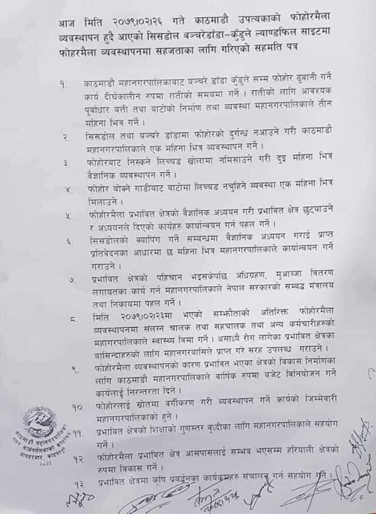 काठमाडौं । काठमाडौं महानगरपालिका र सिसडोल बञ्चरेडाँडा–कुँडुले ल्याण्डफिल साइट क्षेत्रका बासिन्दाबीच १९ बुँदे सहमति भएको छ ।
