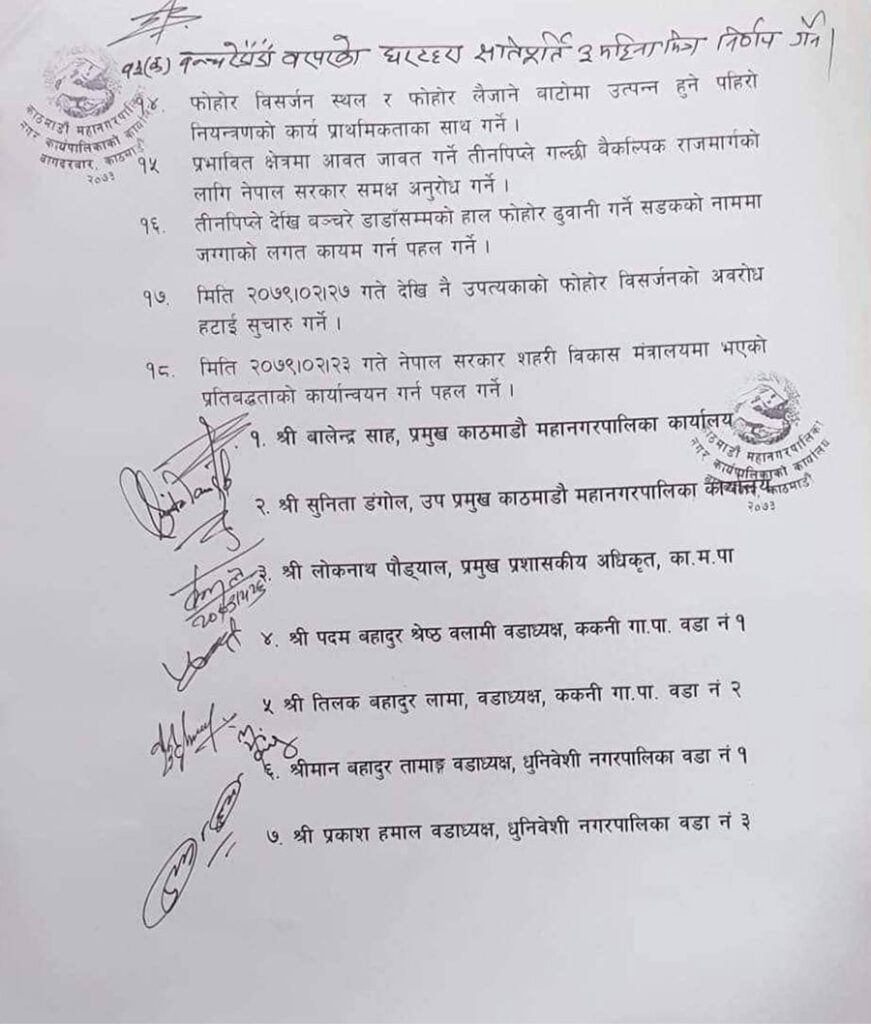 सिसडोल तथा बन्चरे डाँडामा फोहोरको दुर्गन्ध नआउने गरी काठमाडौं महानगरपालिकाले एक महिनाभित्र व्यवस्थापन गर्ने, फोहोरबाट निस्कने लिच्चड खोलामा नमिसाउने गरी दुई महिनाभित्र वैज्ञानिक व्यवस्थापन गर्ने, फोहोर बोक्ने गाडीबाट बाटोमा लिच्चड नचुहिने व्यवस्था एक महिनाभित्र मिलाउने लगायतका सहमति पनि भएको छ ।