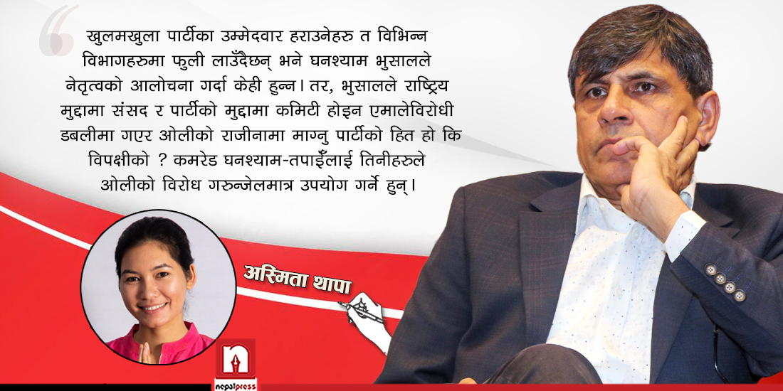 त्यसैले राजीनामा मागेकै कारण वा चुनावी समीक्षामा नेतृत्वको आलोचना गरेकै कारण घनश्याम वा अरु कोही पनि कारबाहीको भागीदार बनाउन खोजिएको हो भने त्यो मान्य हुन्न । अनुशासन आयोगको यो कदम कमरेड भुसाललाई विपक्षीको सहानुभूतिको पात्र बनाउने स्टन्टमात्र हुन्छ ।